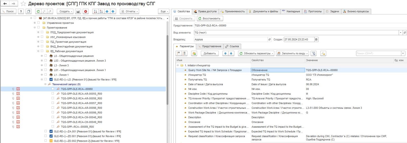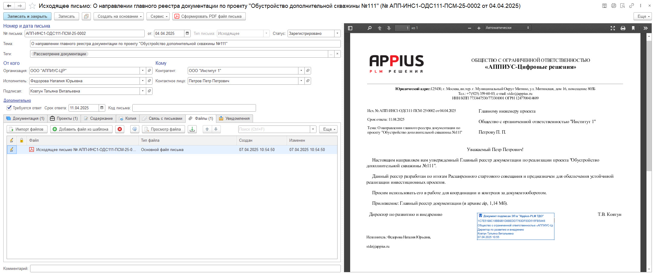 Входящие и исходящие письма также связываются с документацией дерева проектов. Система позволяет формировать PDF файл исходящего письма и выполнять его согласование.