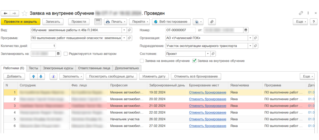 - планирование, проведение и контроль обучений в области ОТ и ПБ с использованием функционала бронирования места в учебном классе;
