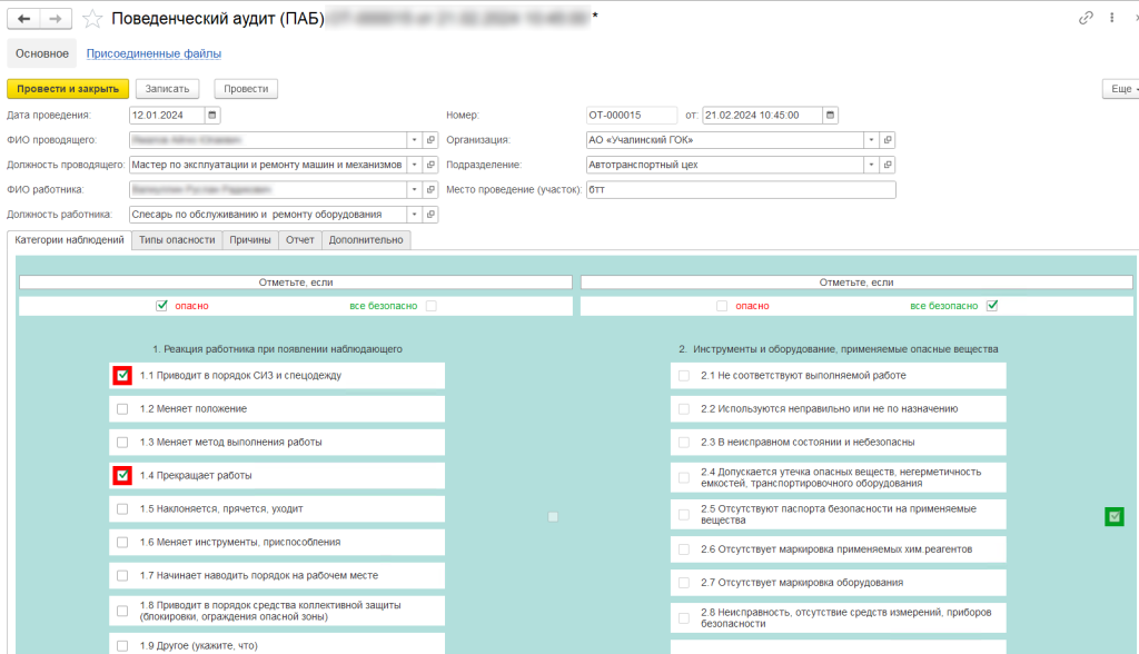 В рамках адаптации ПО под бизнес-процесс, доработана возможность ведения поведенческих аудитов. Функционал реализован с помощью интерактивного чек-листа. В нем специалист по охране труда и руководители структурных подразделений отмечают результаты проведения аудита и указывают на отклонения от норм. Работа с текстовой формой предусмотрена только на этапе формирования отчета – специалист добавляет комментарий, в котором фиксирует принятые меры по устранению нарушений.