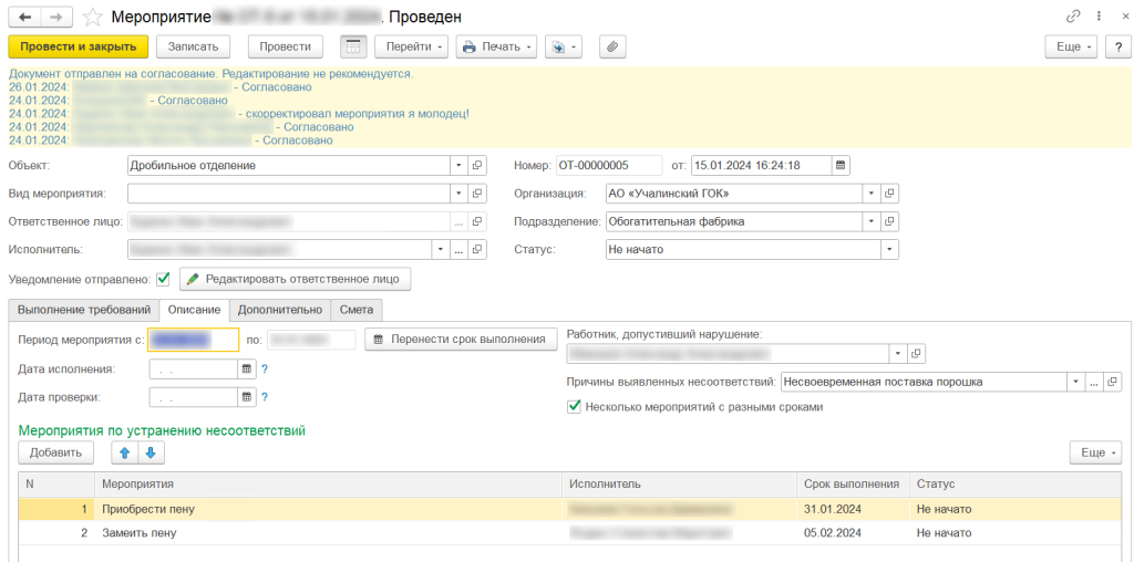 По итогам инспекции ответственный за устранения указывает причину нарушения, готовит план действий по устранению нарушения. Если нарушение имеет высокую степень важности и опасности, то причину и план действий требуется согласовать с тем лицом, кто выявил данное нарушение. Также предусмотрена возможность переноса срока устранения и изменение ответственного лица по согласованию.