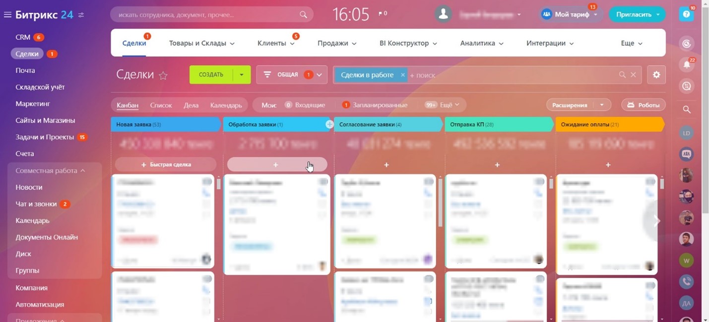 Заявки из почты, сайта, онлайн-магазина на маркетплейсе, мессенджера автоматически сгружаются в «Битрикс24». Система самостоятельно распределяет клиентов между менеджерами. Как только сотрудник заполнит обязательные поля карточки контакта, задача переходит на этап консультации.