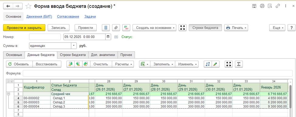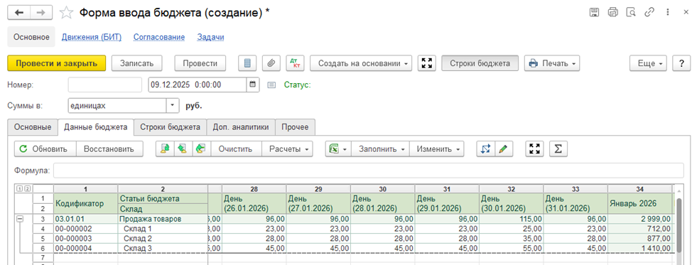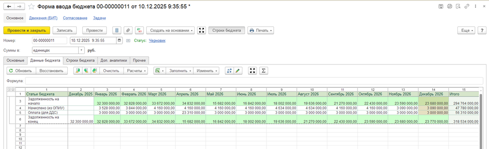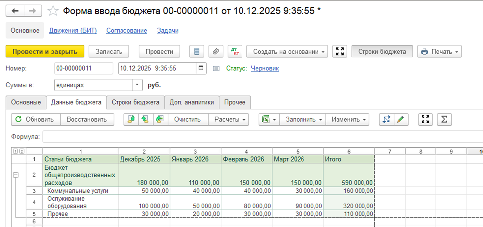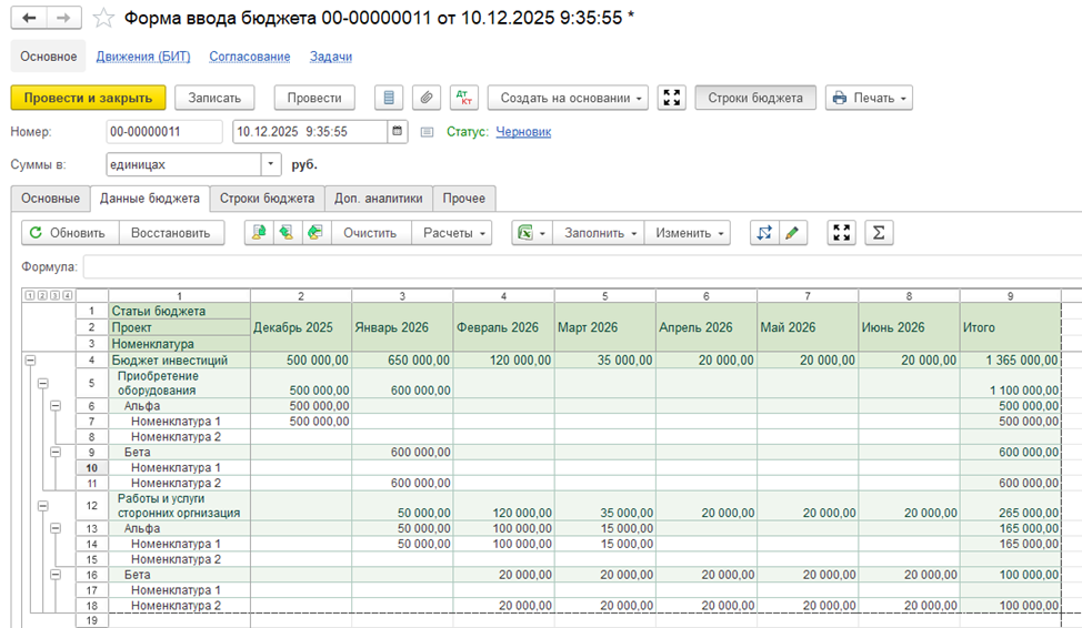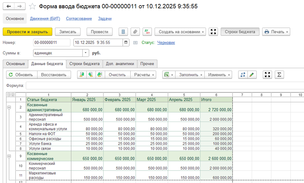 Бюджеты формируются непосредственно в системе: пользователь открывает бюджетный документ и вручную вводит плановые показатели. Такой способ удобен для оперативного планирования, корректировок и сценарных расчетов, когда важно быстро зафиксировать управленческие решения без промежуточных файлов и внешних инструментов.