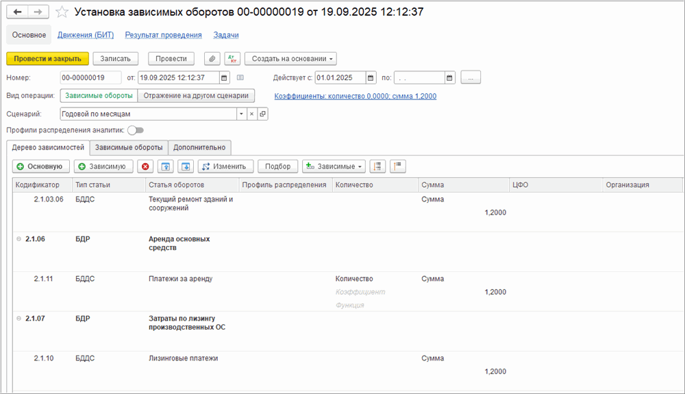 Документ «Установка зависимых оборотов» в БИТ.ФИНАНС