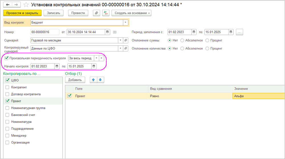 Периодичность контроля настраивается гибко: лимиты могут устанавливаться на месяц, квартал, год или произвольный период. Эти параметры задаются либо в справочнике «Сценарии бюджетирования», либо непосредственно в документе установки контрольных значений, что позволяет учитывать особенности планирования в конкретной компании.