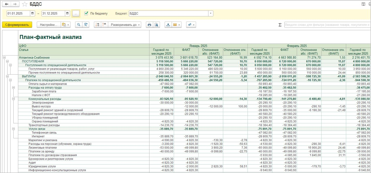 По итогам периода формируется план-фактный анализ: выявляются отклонения, их причины и зоны риска. Анализ строится на фактических данных, а не на предположениях, что позволяет объективно оценивать эффективность управленческих решений.
