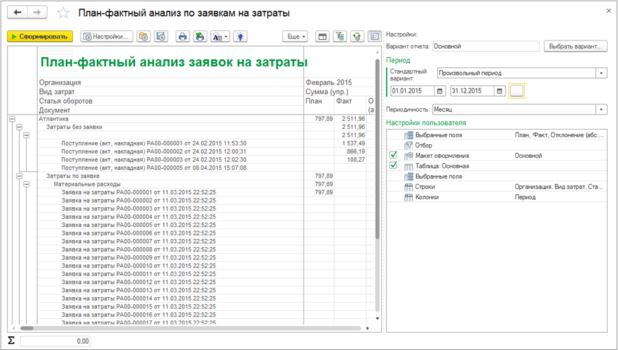 Отчет «План‑фактный анализ по заявкам на затраты» в БИТ.ФИНАНС