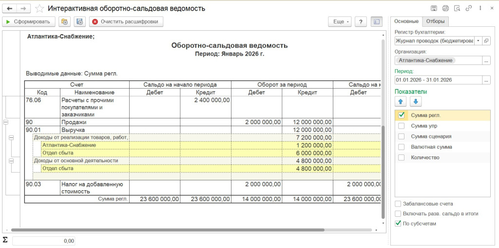 После нажатия кнопки «Сформировать» отчет принимает привычный вид классической оборотно-сальдовой ведомости, но при этом остается интерактивным. Любую строку можно расшифровать двойным щелчком мыши: система предложит доступные варианты детализации, которые можно последовательно раскрывать до нужного уровня — вплоть до конкретных проводок.
