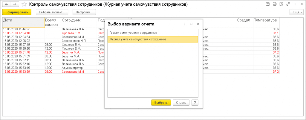 Красным цветом будут акцентироваться данные о превышении температуры от 37 градусов Цельсия. Отсортировать информацию можно по величине температуры, подразделению фирмы, периоду.