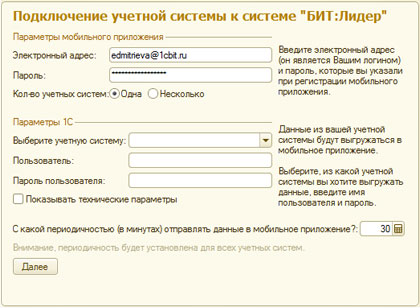 При создании пользователя БИТ.Лидер (подключение учетной системы к системе БИТ.Лидер) указывается периодичность отправки данных. Сервер 1С:Предприятия будет отправлять данные с заданной периодичностью.