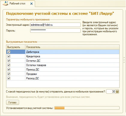 Нажмите кнопку «Готово». Будет произведено сохранение введенных данных, затем выполнится процедура регламентного задания (данные из Вашей учетной системы будут отправлены в систему «БИТ:Лидер»). Также будет активирован режим автоматической отправки данных с заданной периодичностью с помощью окна «Автоматическое выполнение регламентных заданий».