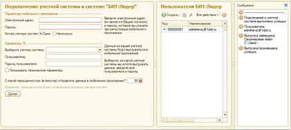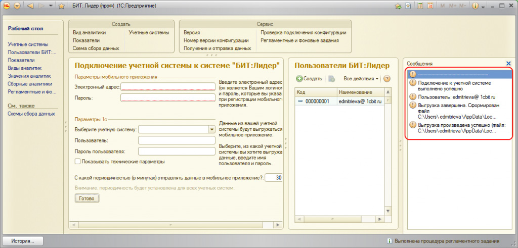 В правой части экрана появится окно «Сообщения» и будут показаны сообщения системы о подключении к Вашей учетной системе и выгрузке данных в систему «БИТ:Лидер».