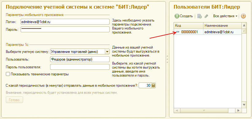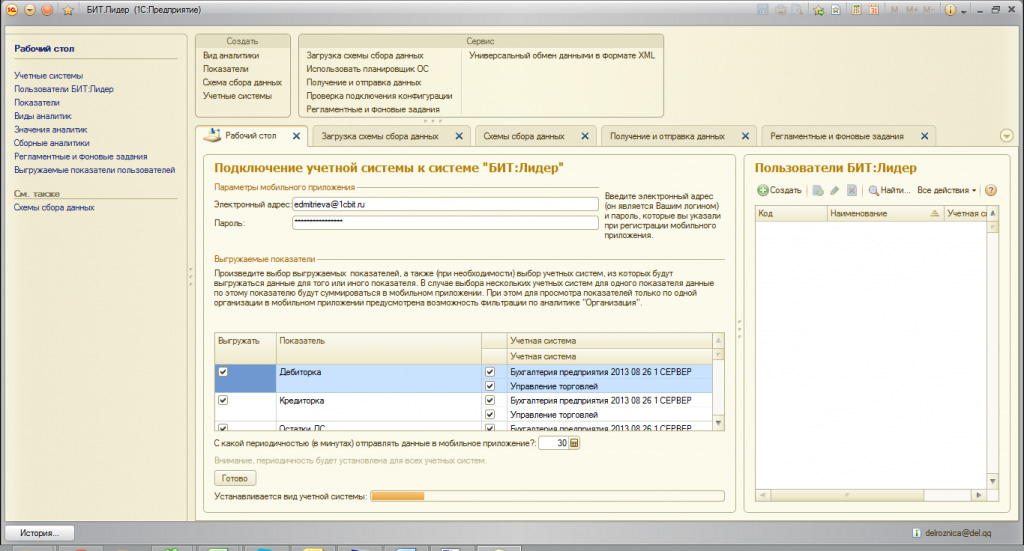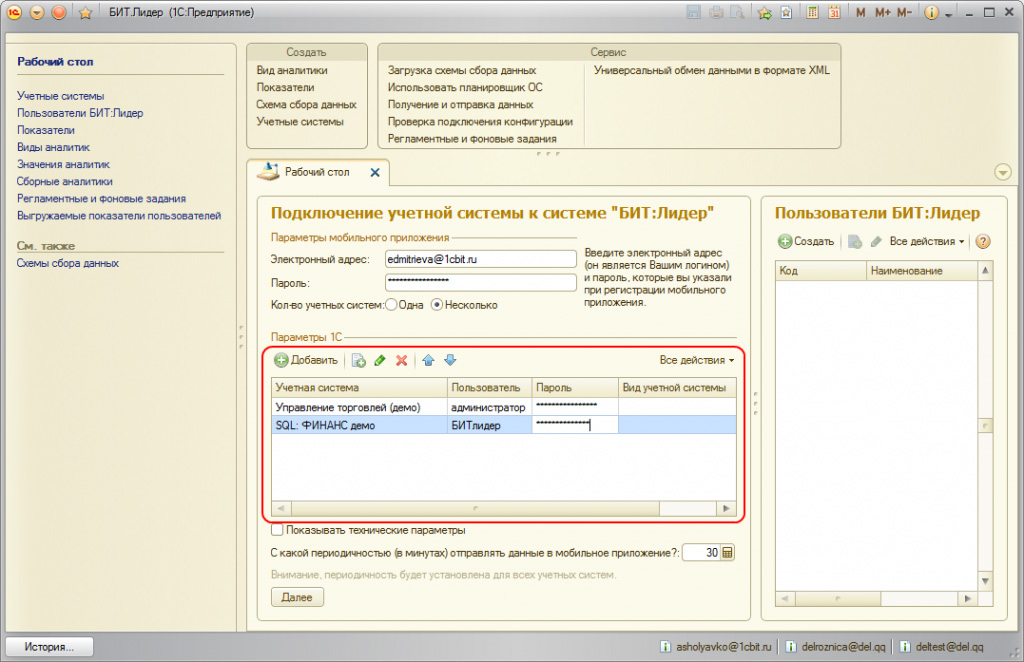 В правой части рабочего стола конфигурации БИТ:Лидер находится список «Пользователи БИТ:Лидер». Проверьте, правильно ли указан Ваш e-mail.