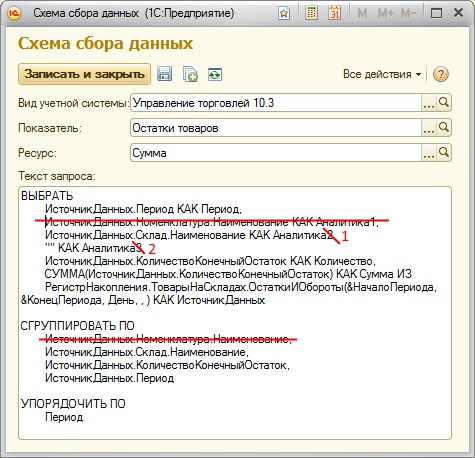 В этом случае стандартная схема сбора данных должны быть изменена. Ниже приведены изменения в запросе по остаткам товаров по исключению аналитики по товарам: